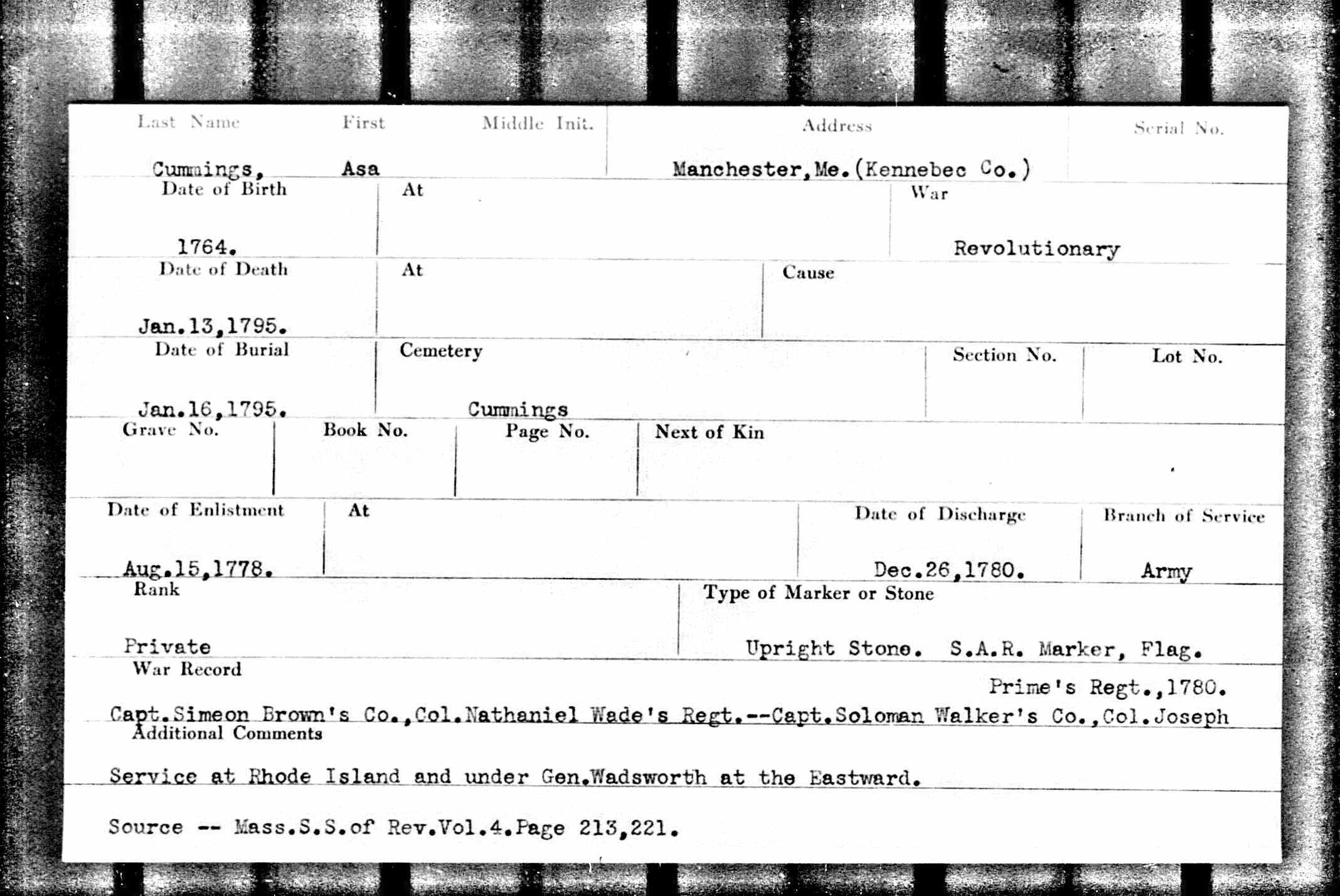 Private Asa Cummings (1764–1795)