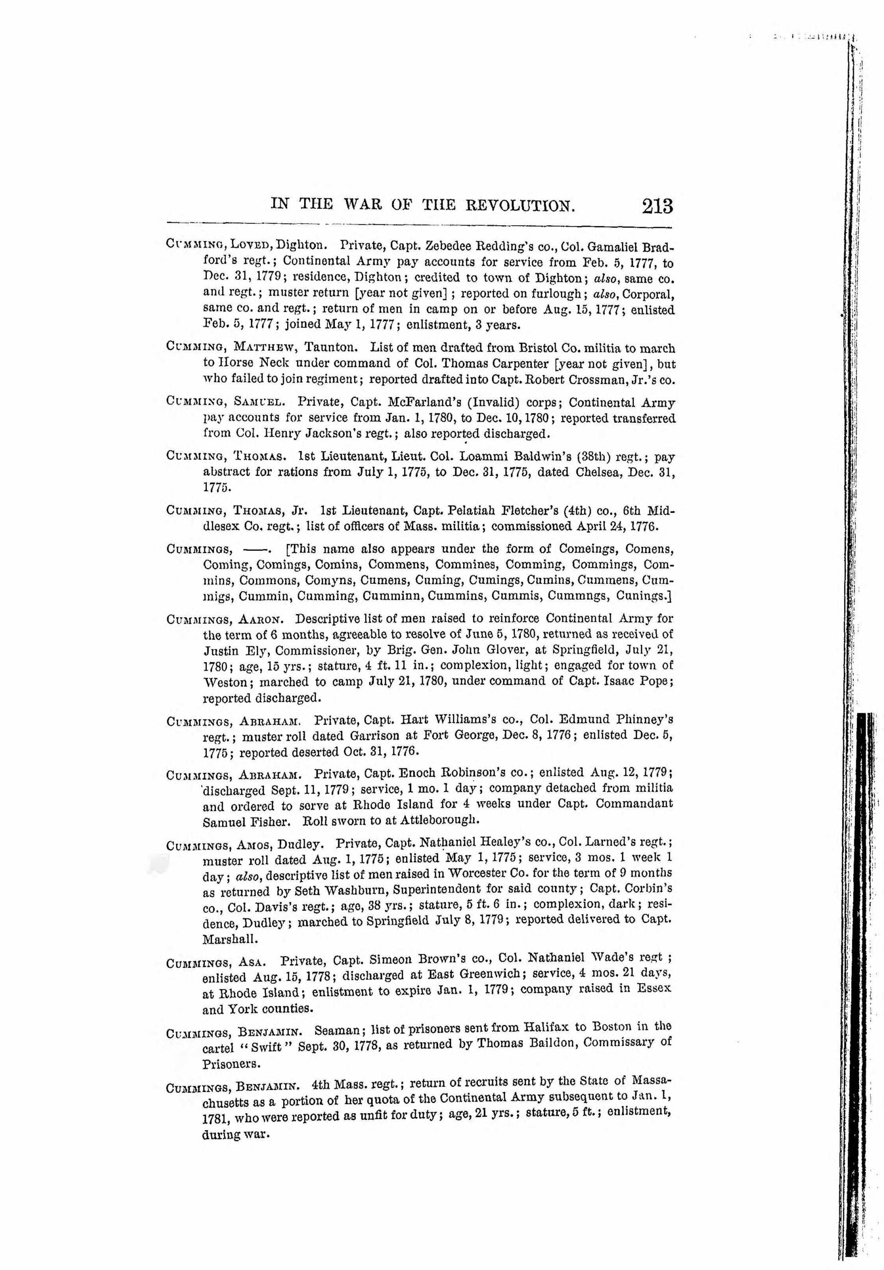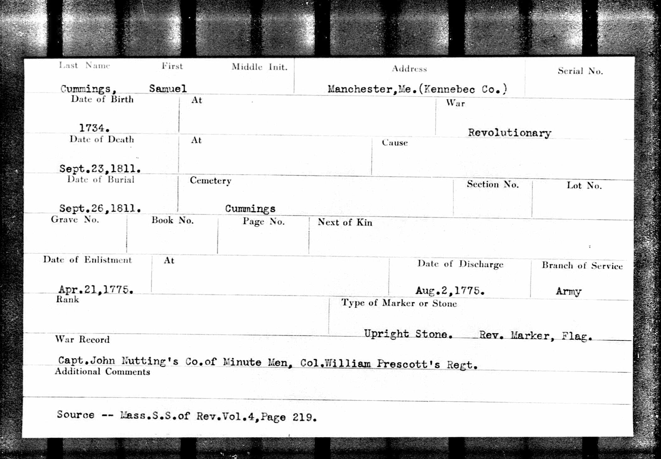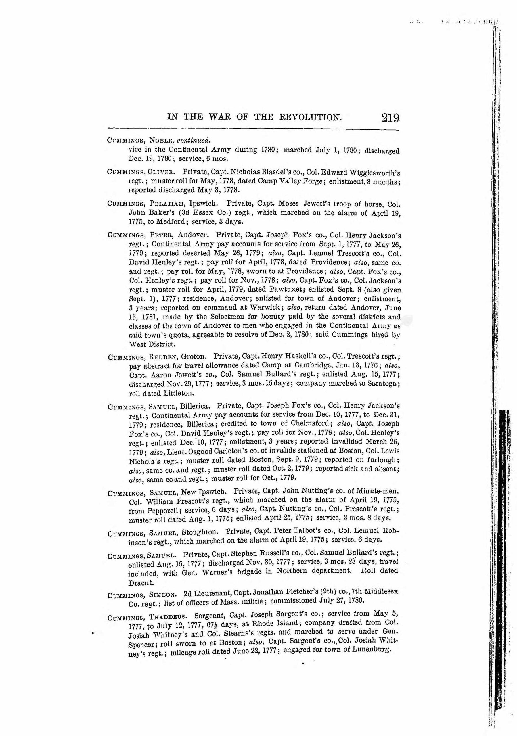 Samuel Cummings Jr. enlisted in Capt. Russell's Company, Col. Bullard's 5th (Middlesex County) Regiment, Massachusetts Militia, immediately after the Battles of Lexington & Concord.